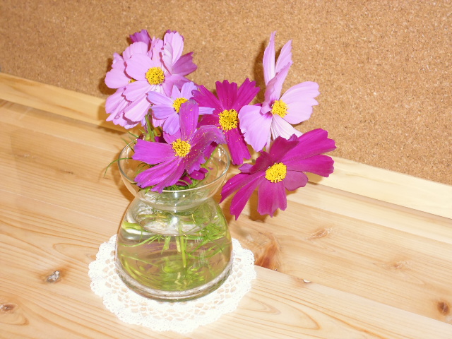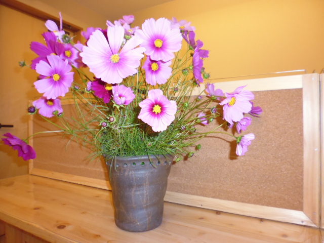 そんな中先日、とあるヘルパーさんが訪問先からの帰り道できれいに咲いてたから…とコスモスの花を持って来て下さいました。濃いピンクや薄いピンク…彩りも本当にきれいです!